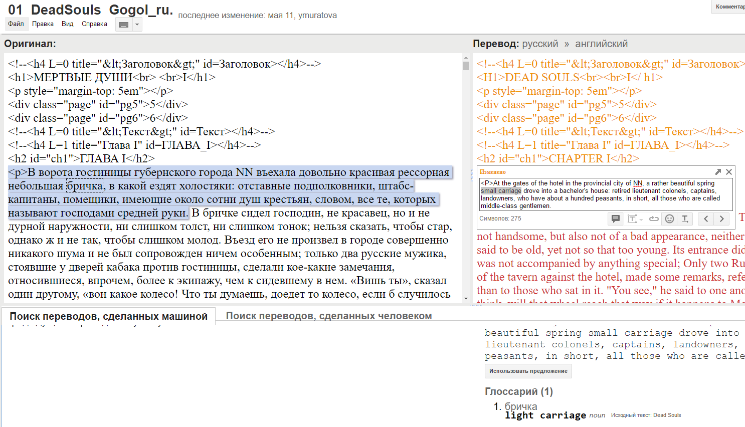 This led me to wonder how that aspect of a text might be handled in a localization project. I set two goals before myself: (1) to figure out how to make page numbers in a regular (.epub) e-book, and (2) whether I could make page numbers appear in a .mobi file I uploaded to my kindle. So I chose one of my favorite books by Nikolai Gogol, Dead Souls, and set out to mock translate it into an English-language e-book, finding the answers to my questions at the same time.